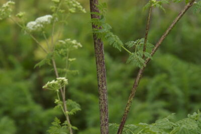 Two noxious plants that are managed during early spring are Garlic Mustard (Alliaria petiolata) and Poison Hemlock (Conium maculatum). Both are biennial plants, meaning that their life cycle takes place over two years. In the first year, they produce low-growing rosettes of leaves and develop deep taproots. In their second year, they send up a central stem with flowers and produce seeds. As these species establish in an area, they begin to obstruct nutrient cycling at an accelerated rate, altering the soil pH and severing mycelium networks in the soil so that native plants cannot utilize soil nutrients. Both plant species produce thousands of seeds that in turn thrive in the habitat they altered. The seeds are commonly spread via waterways during flood events, so monitoring riparian areas is a large part of management for species. These behaviors demonstrated are just a few examples of how invasive plants threaten native plant communities, causing native populations to decline and creating food deserts for wildlife. In their first year of growth, these plants can be easier to pull up and dispose of but ensure you take precautions when removing poison hemlock! The leaves are carrot-top like but the stems are speckled with purple dots. All parts of poison hemlock are poisonous if ingested and the sap can cause inflammation to bare skin, so protective clothing is a must!
