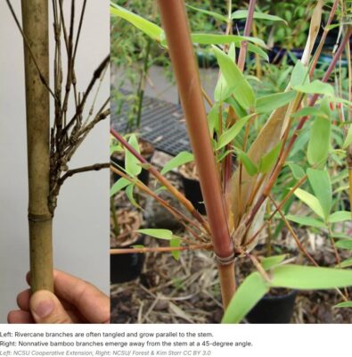 While we monitor noxious plants along the waterways of Beargrass Creek or the Ohio River, there are plenty of interesting native plants as well that support a healthy ecosystem by stabilizing soil and providing food and habitat for wildlife. Rivercane (Arundinaria gigantea) is just one of these plants, and to the untrained eye it could look like bamboo (a nonnative invasive). Both species are in the grass family, specifically woody grasses, and create large thickets. The dense vegetation once created by rivercane are called “canebrakes” that wildlife uses for cover and birds are known to nest in, all while the soil is held in place by their extensive rhizomes. If you are trying to identify between native cane and bamboo, the best difference lies in the branching! Rivercane branches extend from the node parallel to their stem, while non-native bamboo branches grow from the node at a 45-degree angle.